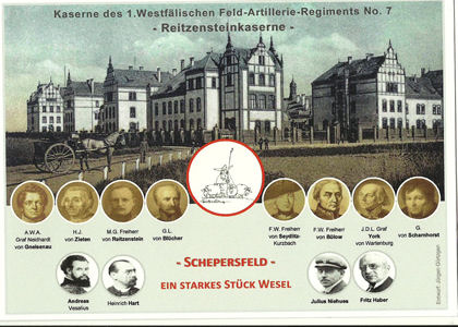 *(1855 †1906). Julius Niehues (*1886 †1945) war einer der bedeutendsten Gleitflug-Pioniere. Maximilian Gustav Freiherr von Reitzenstein (*1859 †1936) war als Oberst der letzte Friedenskommandeur des 1. Westfälischen Feldartillerieregiments No. 7, das in der nach ihm benannten Kaserne stationiert war. Aus dem Ersten Weltkrieg kehrte er als General und Befehlshaber der 239. Division zurück. Gerhard Johann David von Scharnhorst (*1755 †1813), preußischer General und Leiter des Kriegsministeriums. Neben Gneisenau war er - als Vorsitzender der Militärreorganisations-Kommission seit 1807 - der entscheidende Organisator der folgereichen Preußischen Heeresreform. Da er am deutlichsten den Zusammenhang zwischen Militärreform und gesellschaftlichen Veränderungen erkannte, gilt er noch heute als der Vorbildlichste der Militärreformer der Zeit der Befreiungskriege. Friedrich Wilhelm von Seydlitz (*1721 in Kalkar; †1773), preußischer General der Kavallerie unter Friedrich dem Großen. Er lieferte ein besonderes Beispiel für die Auslegung preußischen Gehorsams. Während der Schlacht von Zorndorf verweigerte er mehrmals den Befehl des Königs, mit seinen Kavallerieeinheiten in die Schlacht einzugreifen, obwohl ihm gedroht wurde er hafte mit seinem Kopf für den Ausgang der Schlacht. Seydlitz griff erst dann an, als er durch seinen Angriff die maximale Wirkung erzielen konnte. Dies trug zum siegreichen Ausgang der Schlacht maßgeblich bei. Seydlitz gehorchte dem Befehl seines Königs nicht dem Wort nach, sondern nach dem Sinn. Diese selbständige Prüfung, ob die wörtliche Ausführung eines erhaltenen Befehls die dahinter stehende Absicht des Erteilenden trifft, ist wesentlicher Bestandteil der heute bei der Bundeswehr üblichen Auftragstaktik. Andreas Vesalius Die Straße ist benannt nach dem Begründer der modernen Anatomie (*1514 †1564). Seine Familie stammt aus Wesel. Er war Leibarzt Kaiser Karls V. und dessen Sohn König Philipps II. von Spanien Ludwig, Graf Yorck von Wartenburg (*1759 †1830), preußischer General. Er schloss 1812 auf dem Rückzug der Grande Armee aus Russland die Konvention (Abkommen) mit den Russen in Tauroggen. Damit war ein wesentlicher Anstoß zu den Freiheitskriegen gegen Napoleon erfolgt. Yorck wird als strenger und unzugänglicher Charakter geschildert, der seine Ziele mit großer Hartnäckigkeit verfolgte. Bei der Mannschaft war er wegen seines Bemühens um das Wohl der Truppe beliebt. Hans-Joachim von Zieten , seltener auch Ziethen (*1699 †1786), genannt Zieten aus dem Busch, war einer der berühmtesten Reitergeneräle der preußischen Geschichte und ein enger Vertrauter König Friedrichs des Großen.